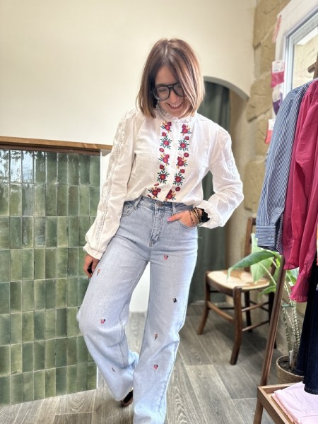 Craquez pour ce jean en denim clair, sublimé par de délicates broderies fleuries. Avec sa coupe droite flatteuse et son esprit vintage revisité, il s’impose comme un incontournable pour un look tendance et décontracté.