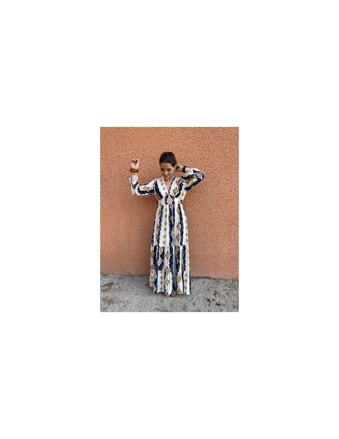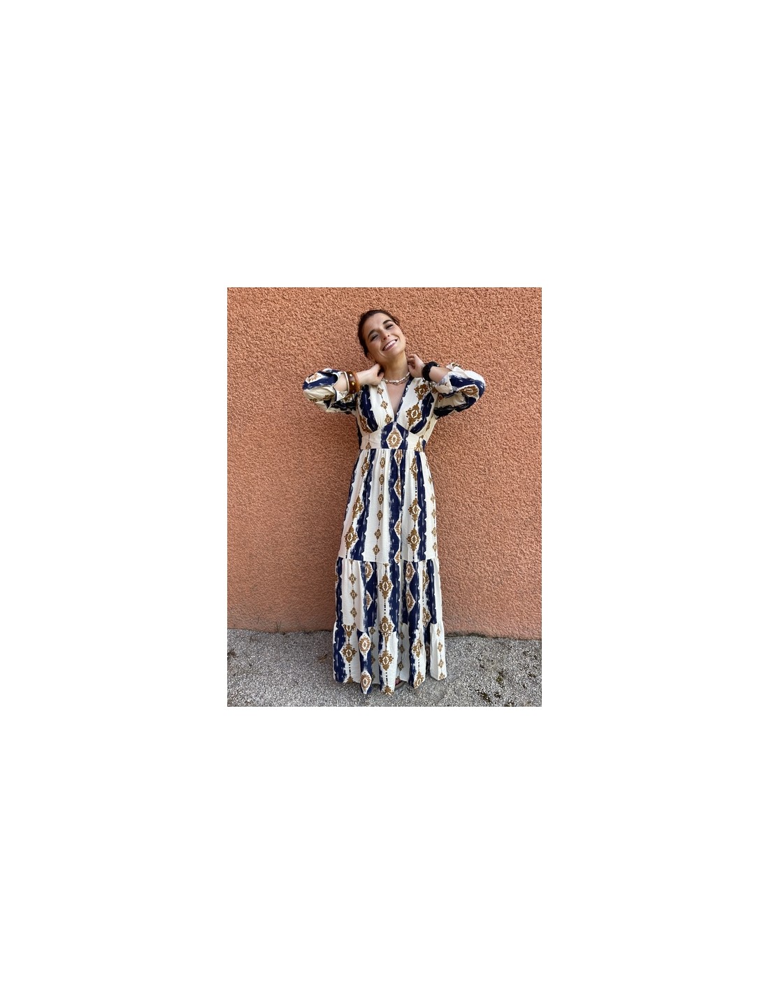 Style : bohème chic avec son imprimé graphique bleu marine et camel.