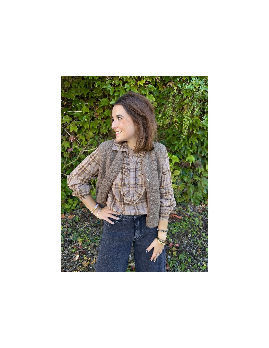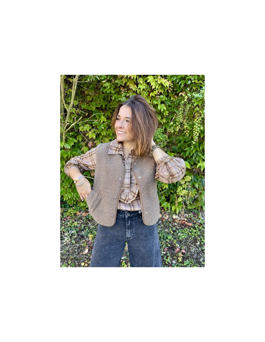 Sans manches, esprit “gilet doudou” : superposé ou seul, il apporte de la texture et de la chaleur.